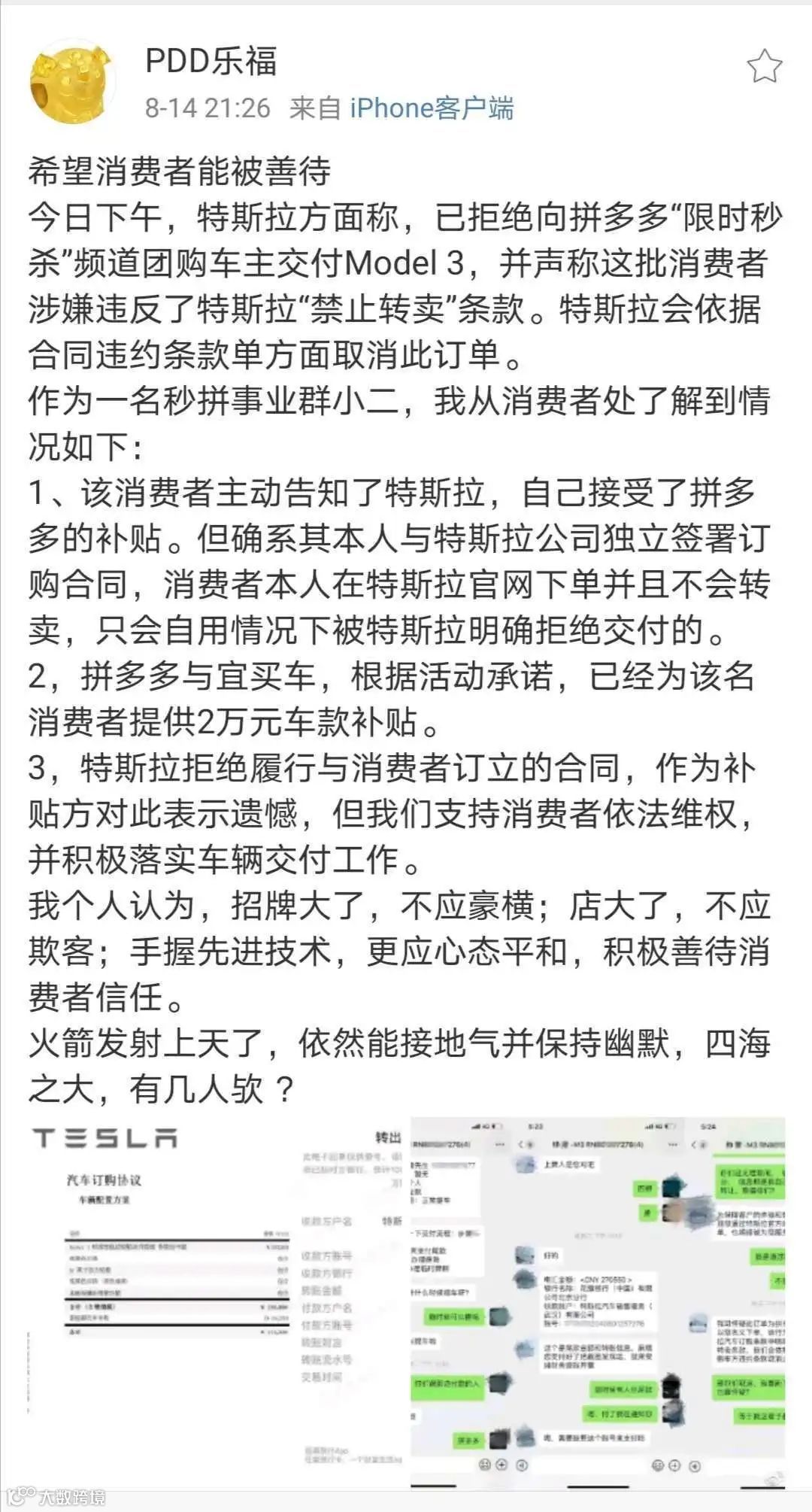 拼多多反应迅速,立即通过“秒拼”事业群小二乐福发言表示,从这名消费者处已证实,该车辆系消费者本人与特斯拉签了订购协议,消费者本人自用且无任何转卖意愿和意图,其购车用车也并未有任何“恶意”。