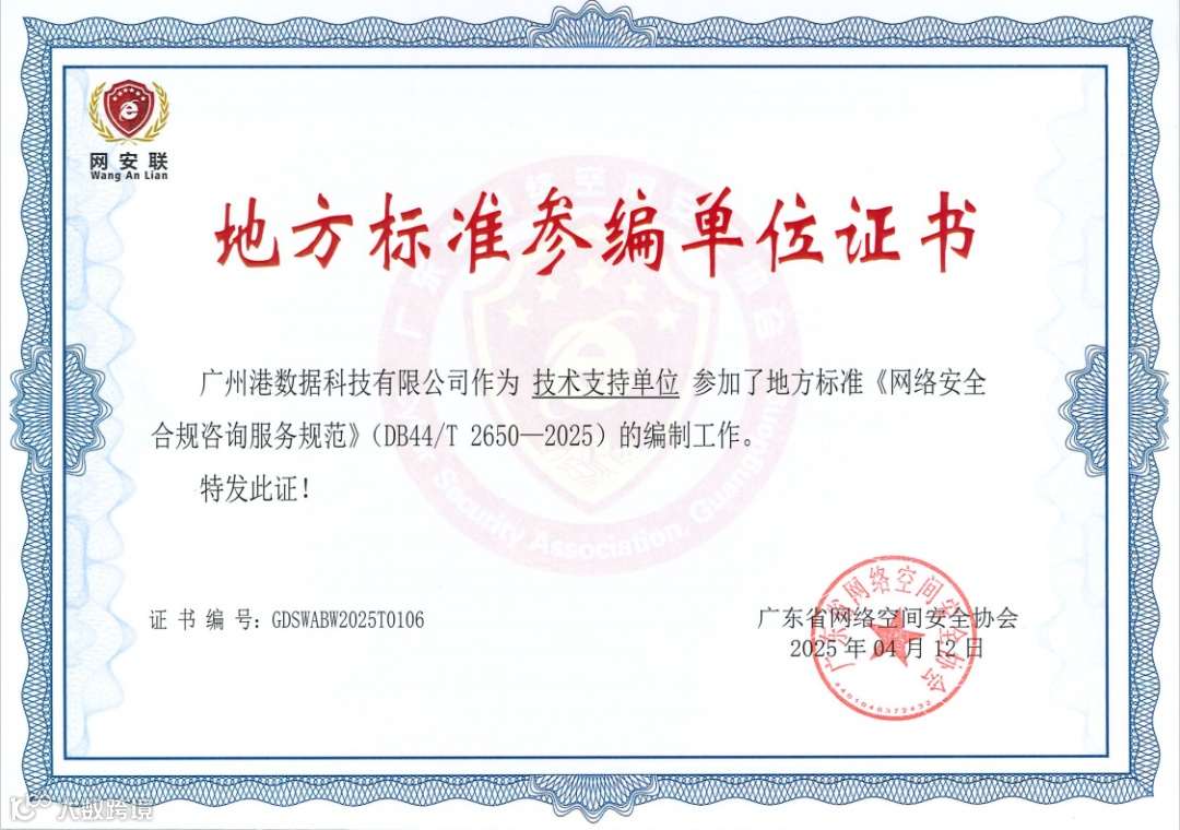 近日,由广州港数据科技有限公司参与编制的广东省地方标准《网络安全合规咨询服务规范》(DB44/T2650-2025)正式发布。此次标准的落地,不仅标志着数据公司在网络安全领域的技术实力与行业话语权再获权威认证,更是深化“科改示范行动”改革、推动行业高质量发展的生动实践。