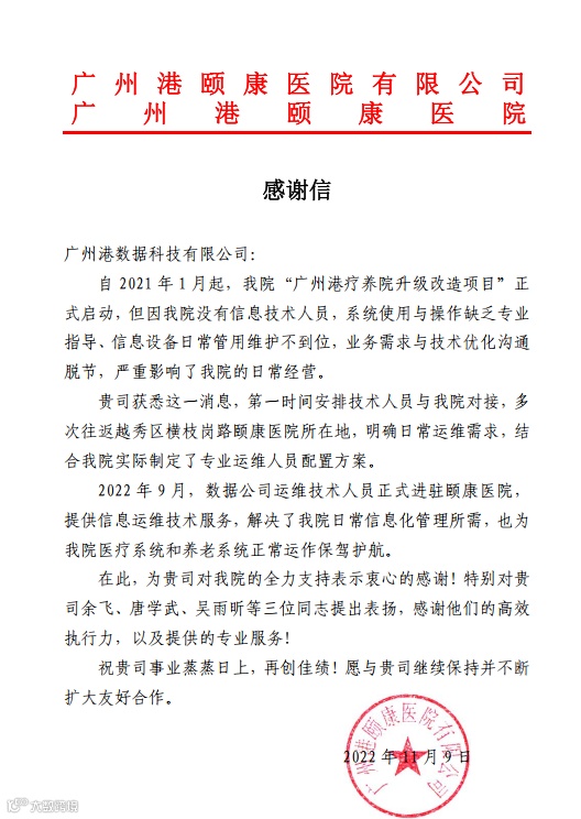 11月9日,数据公司收到一封来自广州港颐康医院的表扬信,信中对数据公司运维技术人员在“广州港疗养院升级改造项目”中的表现给予充分肯定和表扬,并特别对余飞、唐学武、吴雨昕等三位同志提出表扬,感谢他们的高效执行力和专业服务能力!