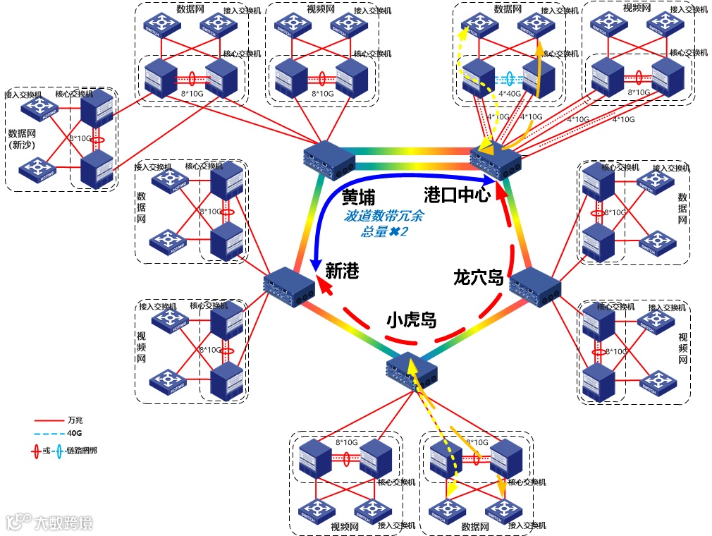通过部署在港口中心、龙穴岛、小虎岛、新港、黄埔的光波分复用传输设备,为数据网、视频网以及市港务局网络提供多路隔离万兆异地波分复用服务,保障单点链路故障不影响网络运行,成为数据和应用集中统一的重要基础支撑,为智慧广州港插上腾飞的翅膀。