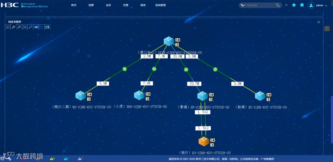 升级后的广州港集团万兆主干网,环路链接港口中心、龙穴岛、小虎岛、新港、黄埔等主要港区,光纤链路总长超过300公里,网络带宽从千兆升级到万兆,为各港区业务提供了运营商级别的网络支撑。