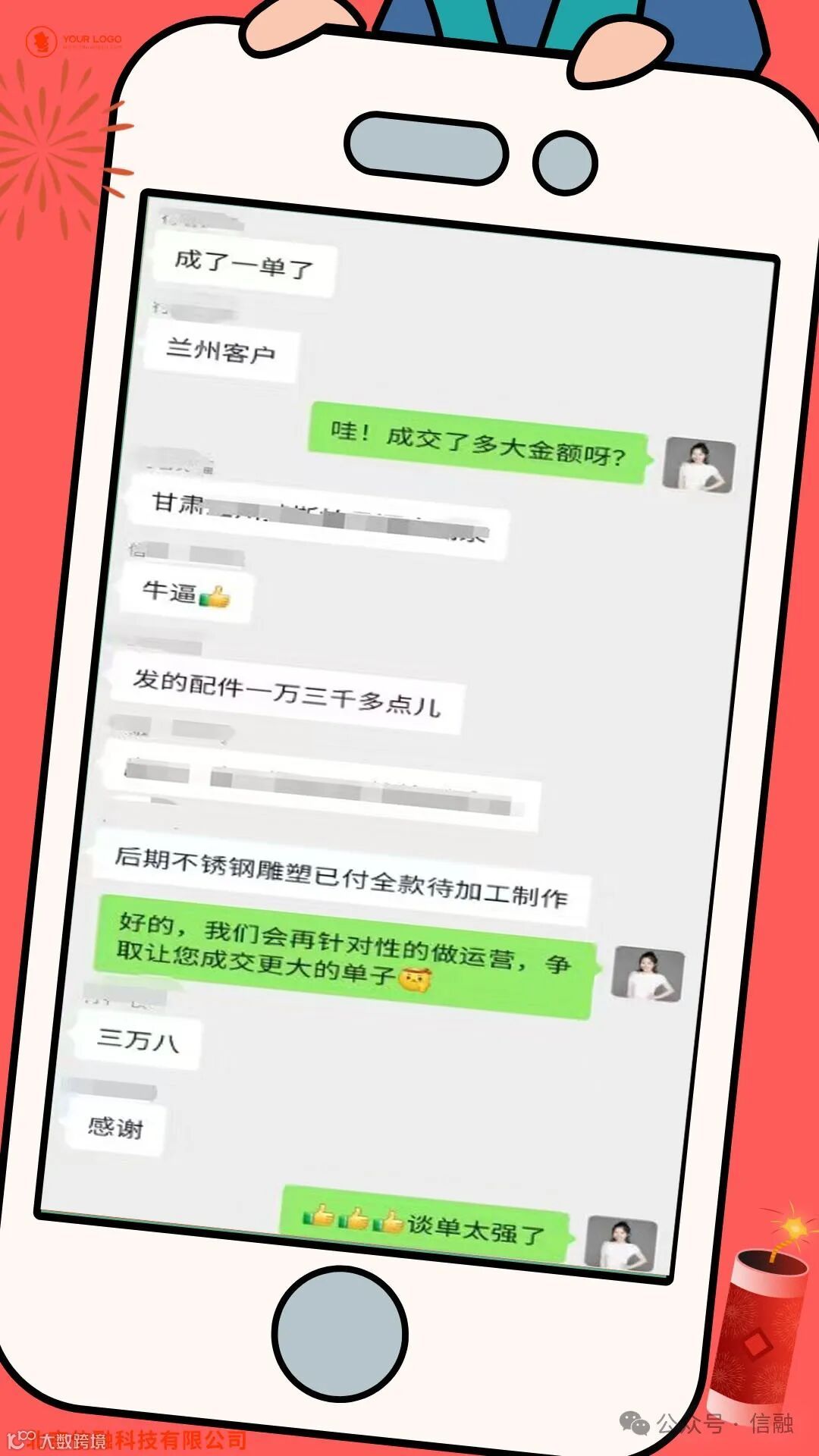 喜报!喜报!大清早群里就发来客户成交喜报,“已经发了配件1万3千多,还有后期的不锈钢雕塑3万8也已经收到全款在加工制作中...”