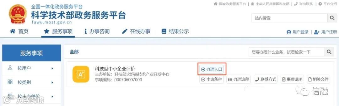 用户访问全国一体化政务服务平台科学技术部政务服务平台(https://fuwu.most.gov.cn),选择“服务事项—科技型中小企业评价”,点击“办理入口”注册登录。
