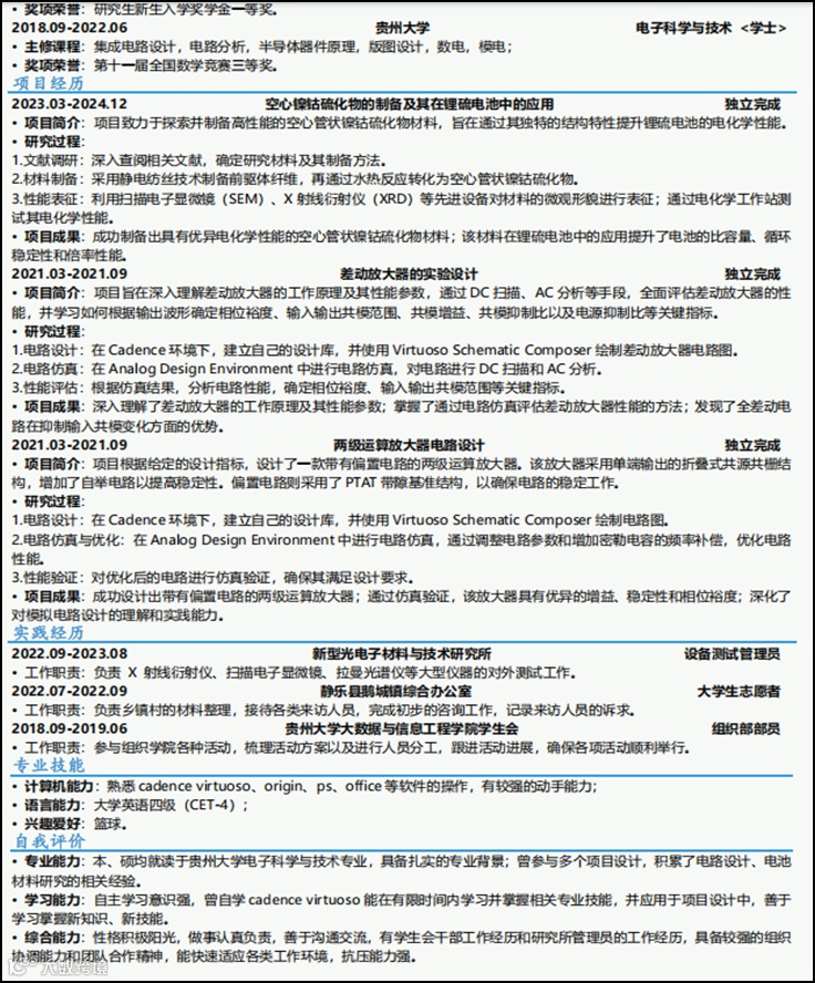 2026届应届毕业生刘同学,是就读于贵州大学电子科学与技术专业的硕士,在校期间,其不仅通过英语四级考试,亲历“空心镍钴硫化物的制备及其在锂硫电池中的应用”的项目,还先后在本校大数据与信息工程学员学生会、静乐县鹅城镇综合办公室、新型光电子技术材料与技术研究所有过实践经验。
