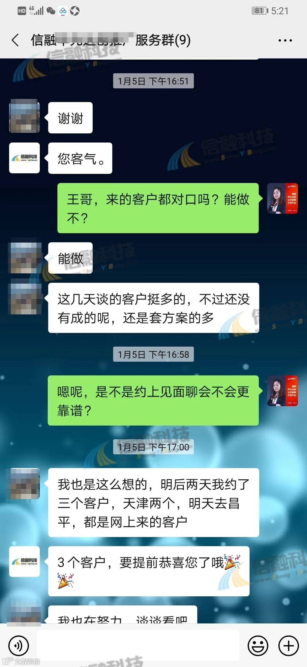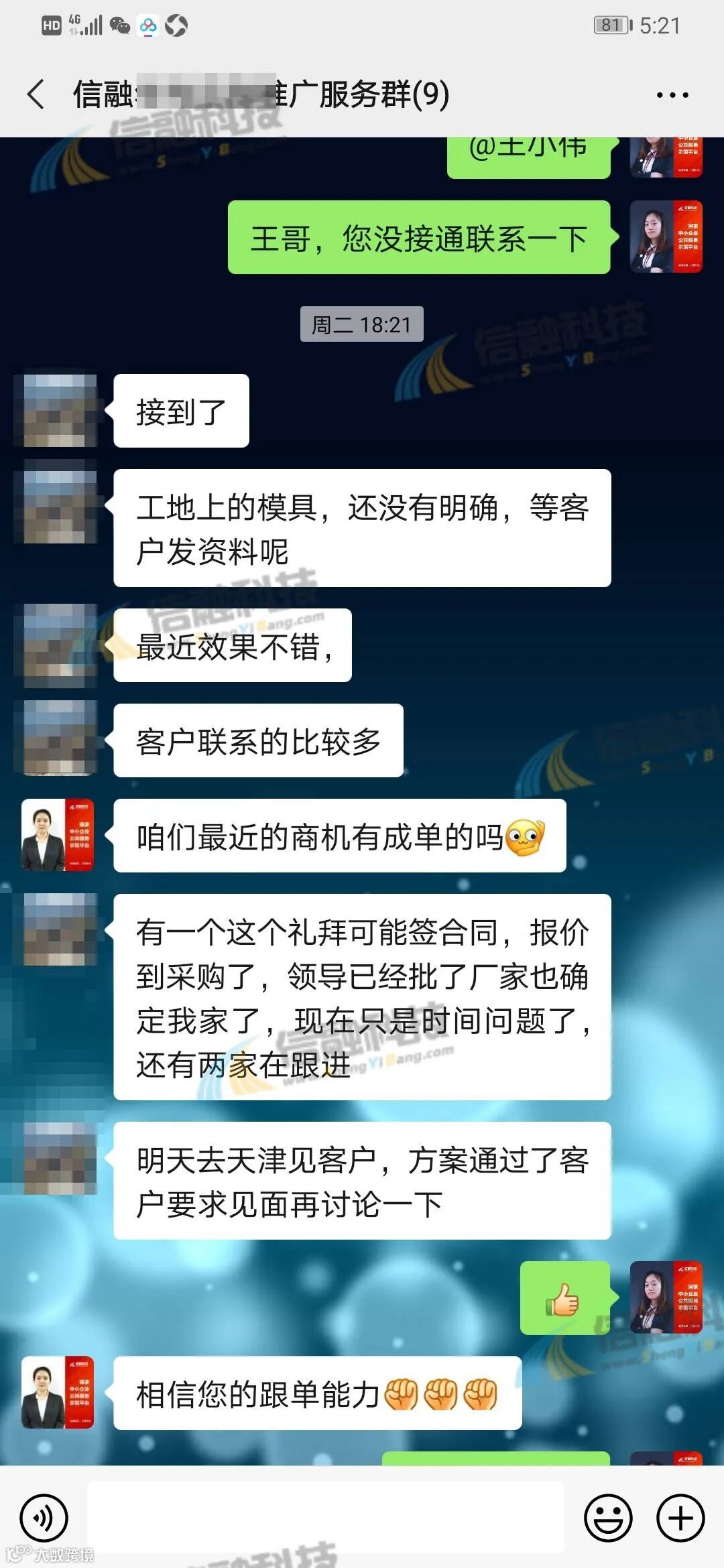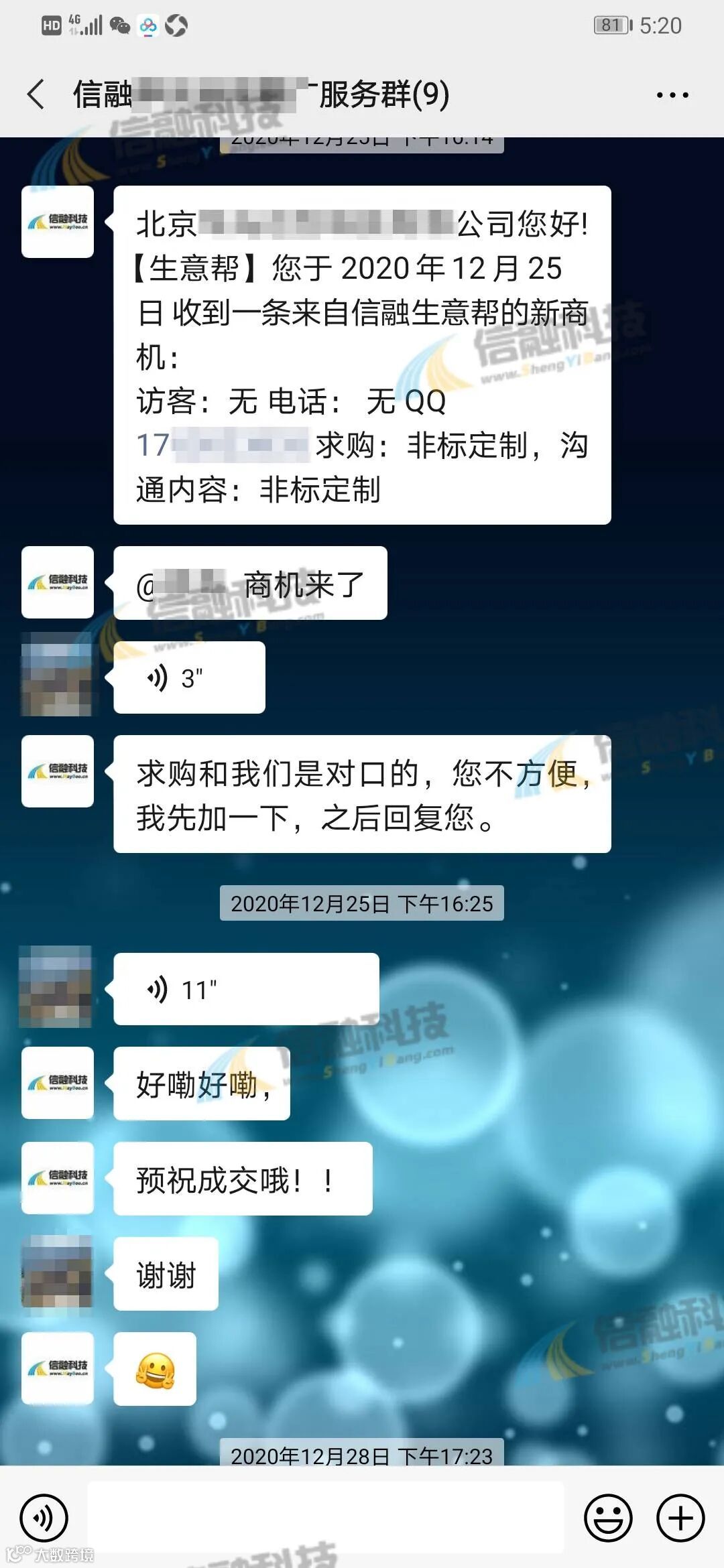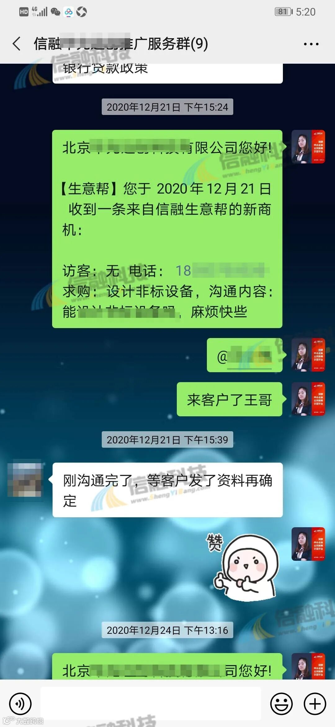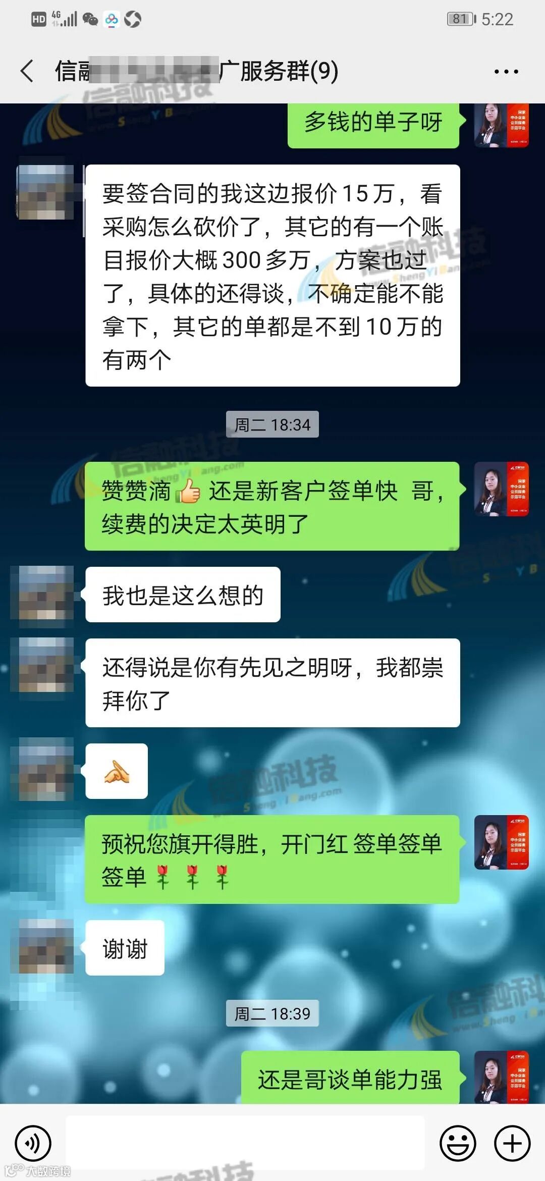 据客户反馈,合作至今,信融每月都能为他推送近百的有效商机,他已经从这些商机中积累了数十个稳定大客户,每笔成交金额都在十万以上!在20年12月再次续费后,不到一个月时间,又陆续接到多个精准商机,现已签两单,金额分别是15万与300万,其它也在洽谈中,合作有望。