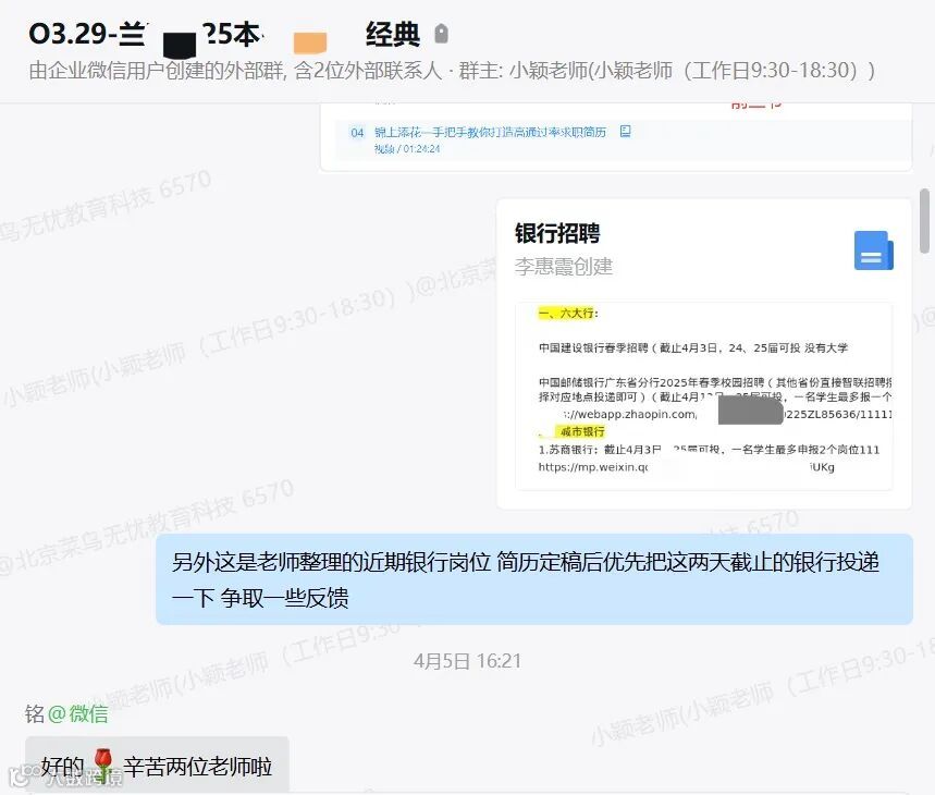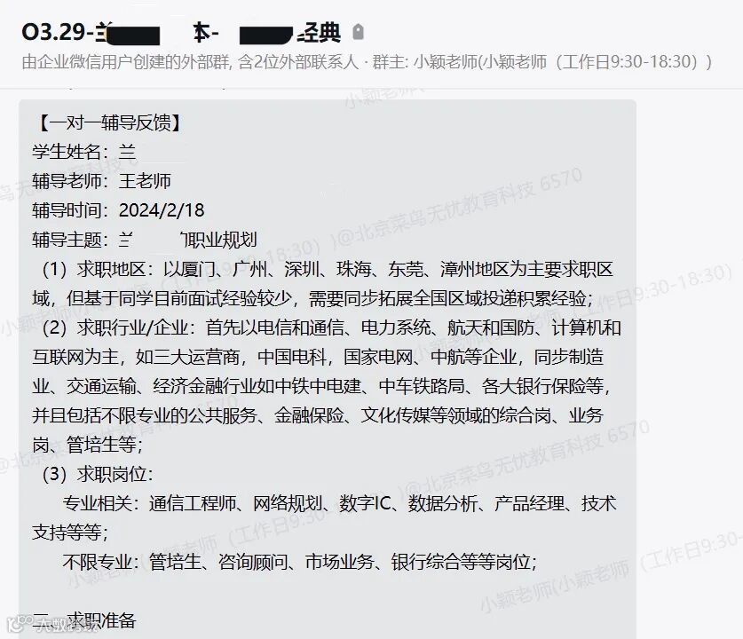 复盘与心态建设:每次面试结束后,导师都会与小兰同学共同复盘,深入分析面试中存在的问题,如紧张情绪、专业知识不足等。高频开展面试模拟训练,一对一面试辅导,一对一面试复盘通过撰写面试逐字稿、加强训练的方式,提升面试能力。通过反复练习与针对性训练,逐一攻克难题,帮助她在不断总结中提升面试表现,同时调整求职心态,以更自信从容的状态迎接后续挑战。
