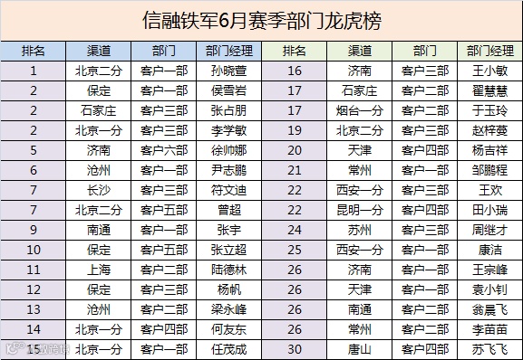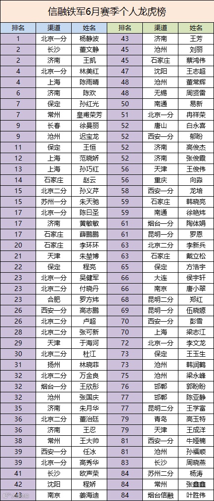 百日大战6月赛季成功结束,近百名持续优秀的铁军将士,和30个目标坚定的铁军部门再登金榜!让我们为金榜题名的信融铁军精英们鼓掌!欢呼!
