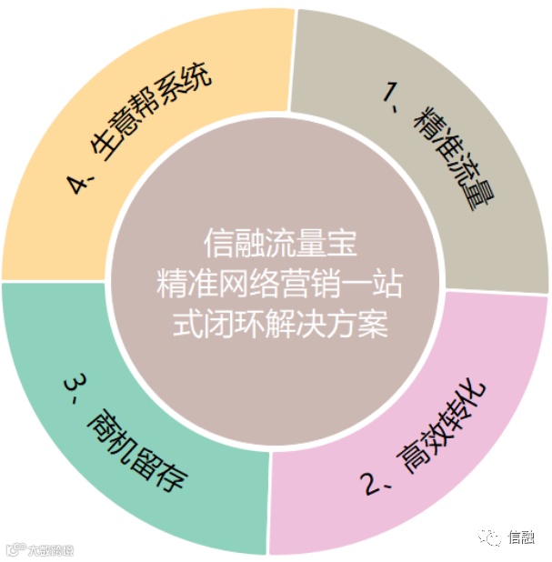 ●终于,至2018年4月,具有划时代意义的精准网络营销一站式闭环解决方案-信融流量宝应时而生。信融流量宝为ToB企业提供:精准流量+高效转化+商机留存+生意帮系统等四项一站式闭环服务。
