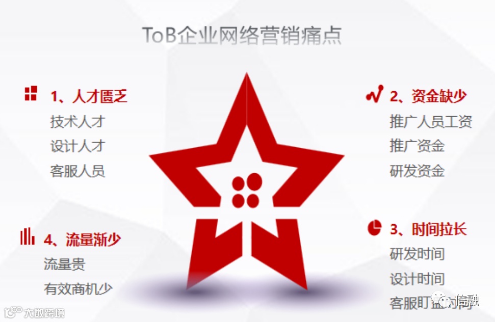 ● 中国ToB企业精准网络营销中的痛点主要是:人才匮乏、资金缺少、时间拉长、流量渐少。
