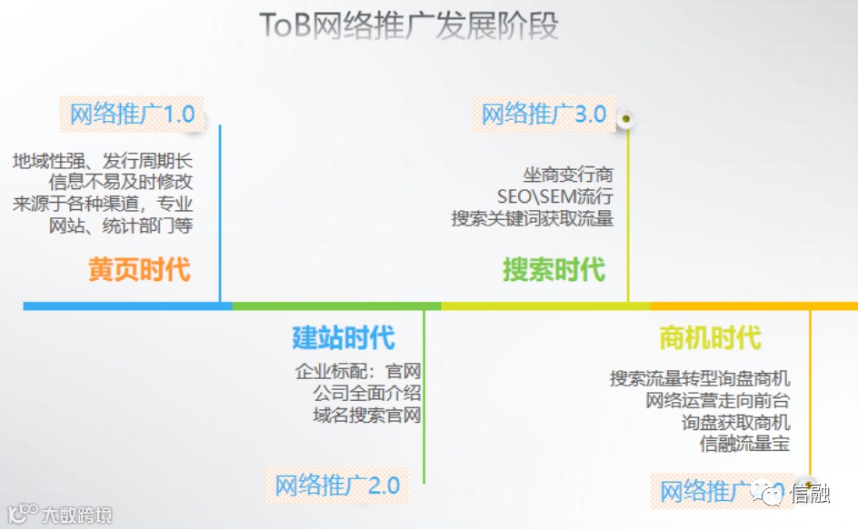 ● 过去20年中国ToB网络营销经历了黄页时代、建站时代、搜索时代,2018年信融流量宝诞生之后,ToB网络营销开始进入商机时代。