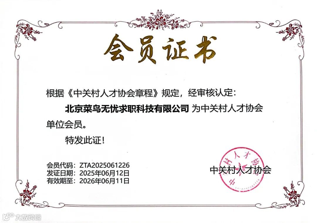 “世界的中关村,人才的地球村”。中关村作为我国创新发展的一面旗帜和全国第一个人才特区,中关村人才协会一直致力于促进高技术人才生态建设为己任。中关村人才协会始终致力于搭建人才与产业的桥梁,推动人才生态建设。此次菜鸟无忧获此殊荣,不仅是对企业专业能力、服务成果的权威认证,更意味着公司将深度融入中关村人才生态体系,与众多优秀机构携手,共享资源、共促发展,为人才服务行业注入新活力。