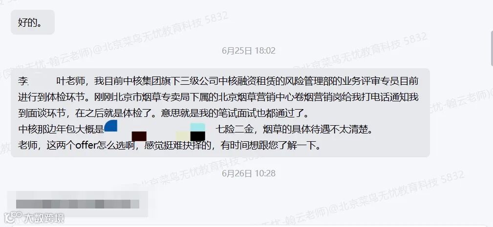 在菜鸟无忧的全程辅导下,李同学最终收获心仪offer,实现从 “没有后续” 到 “稳定就业” 的跨越。成功上岸,实现了与他本人前期规划的求职策略。随后他与指导教师商量分析工作,导师与他一起进行offer分析。