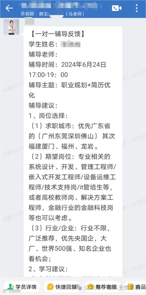 导师通过深度1V1辅导,结合其专业背景与院校地域优势(学校在珠三角就业认可度高),制定 “稳国企 + 冲大厂 + 拓新兴领域” 的三维策略: