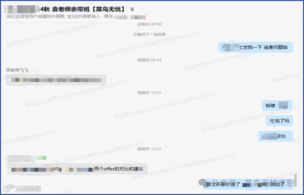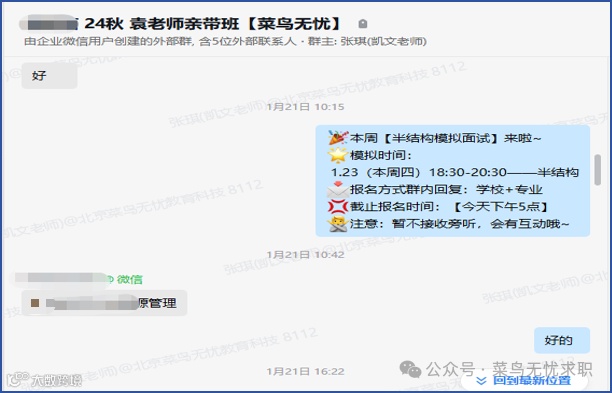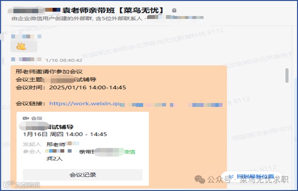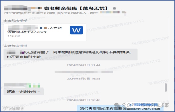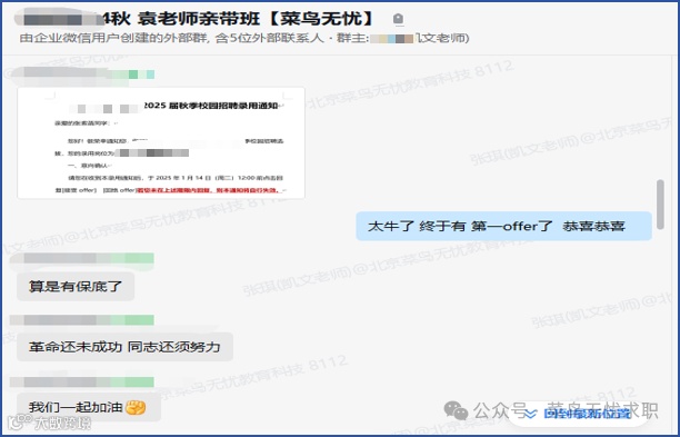 在菜鸟无忧的全程辅导下,小张同学最终收获心仪offer,实现从 “等待机会” 到 “稳定就业” 的跨越。成功上岸,实现了与她本人前期规划的求职策略。在收获心仪offer后学员与袁军老师深入沟通一下具体情况。