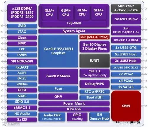 其他细节就比较单调了,最高LPDDR4-2400、最高eMMC5.1/PCIe 2.0/、支持USB 3.0/USB 2.0等,最高4核心(Goldmont+架构)。