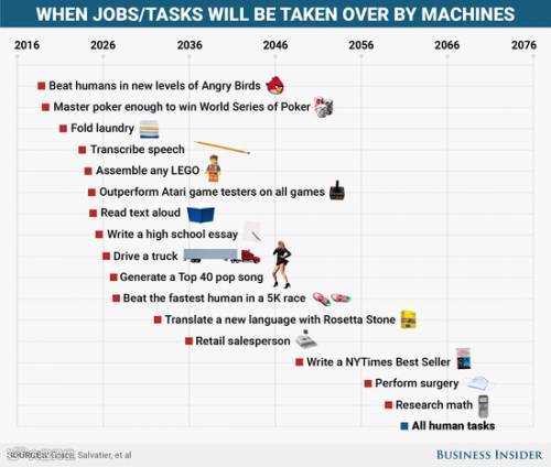 至于那些更复杂和更具创造性的任务,例如写书和进行高等数学运算,则需要更长时间。最终,研究人员发现,到2061年,人工智能将可完成所有人类任务,到2136年将取代所有人类职位。