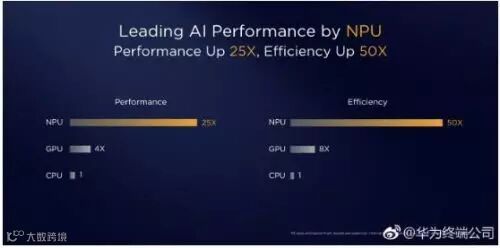 余承东在发布会上表示,在执行神经网络算法方面,麒麟970芯片的NPU具备超越已有CPU、GPU、DSP数倍的能效比和性能。测试数据显示,同样的性能下,麒麟970的NPU所占用的面积仅仅是GPU的一半,CPU的十分之一。在完成同样任务的情况下,能耗只有GPU的十五分之一,CPU的五十分之一。实际运行过程中,峰值功耗不超过1W,可以用更少的耗能更快的完成AI计算任务,因此,除了传统升级优化之外,全新发布的华为旗舰Mate10的AI应用将非常令人期待。