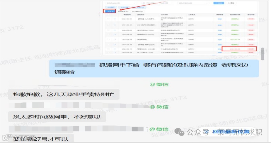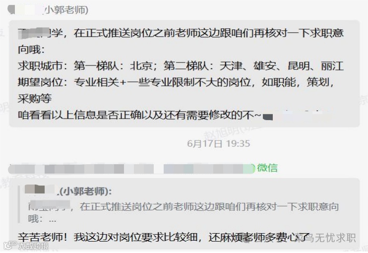 2、求职推进:持续督促投岗,及时了解学员投岗过程中遇到的问题并给予帮助,如学员收到测评通知后,提供对应的参考资料;辅导员老师核对求职意向,使用AI人工智能选岗系统进行精准推岗,根据学员反馈调整岗位推荐。