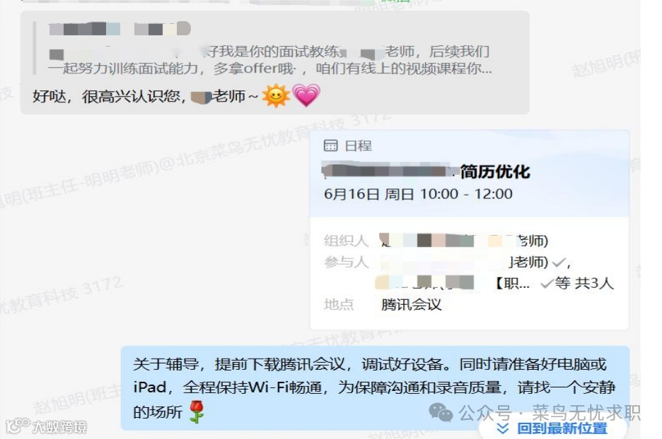 3、面试辅导:面试辅导老师提供群面模拟训练,发送面试学习方案;针对学员面试情况进行1V1辅导,分享面试技巧和经验,如梳理常见面试问题、分析答题思路、强调面试前准备工作等。