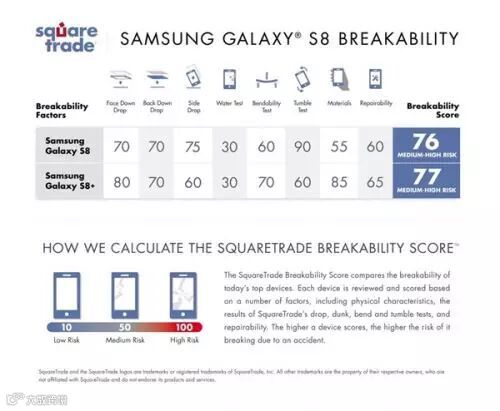 由于采用了全面屏+双曲屏的设计,这让Galaxy S8极为不耐摔,而只要摔到地上,屏幕碎裂的可能性相当大,同时其在1.5米的水下,只能存活30分钟,最终SquareTrade给出Galaxy S8的总分是76分(总分100分),分数越高代表将意外破损的概率越高。