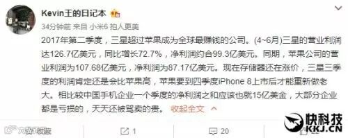 业内人士@Kevin王的日记本 表示,现在存储器还在涨价,三星三季度的利润肯定还是会比苹果高,苹果要到四季度iPhone 8上市后才能重新做老大。
