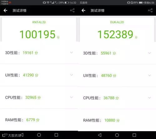 荣耀V8(左)与荣耀V9(右)安兔兔跑分对比