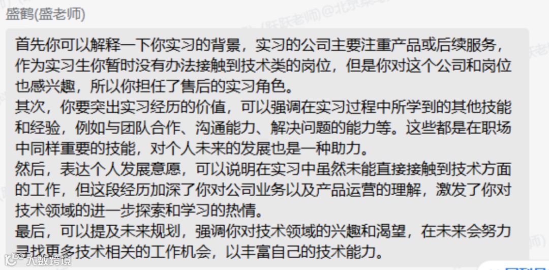 “每次和老师们的交流,都让我感受到他们的专业和用心,”董同学表示,“他们不仅在技术层面给予我帮助,更在心理层面给予我极大的支持和鼓励。”在这段时间里,董同学逐渐摆脱了求职初期的迷茫和无助,重新找回了对未来的信心。