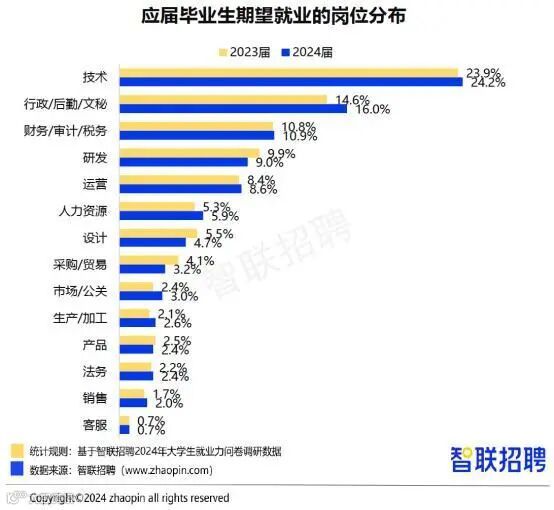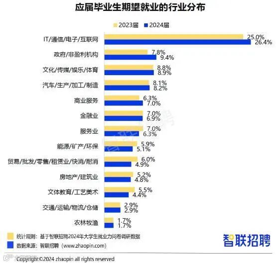 智联招聘调研数据显示,2024届求职毕业生期望行业中,IT/通信/电子/互联网、政府/非盈利机构、文化/传媒/娱乐/体育行业位列前三,占比分别为26.4%、9.4%、8.9%。IT互联网行业为应届生贡献很多就业岗位,也是应届生最向往的行业。