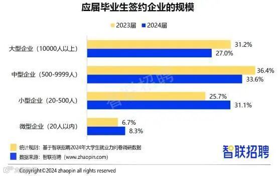 截至今年4月中旬,求职毕业生中,14.7%已经签约用人单位。从签约企业规模看,签约毕业生中,签约小型企业、微型企业的占比分别为31.1%、8.3%,高于去年的25.7%、6.7%。今年签约大型企业的毕业生占比27%,相比去年的31.2%有所下降。随着小微企业的发展壮大,毕业生不再执着于大企业,选择工作的态度更加务实。