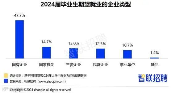 针对找工作的毕业生,调研其就业偏好。从期望就业的企业类型看,2024届求职毕业生中,47.7%希望进入国企工作,占比排名各类型企业之首;其次是国家机关,占比14.7%;期望进入三资企业、民营企业、事业单位的比例分别为13%、12.5%、10.7%。