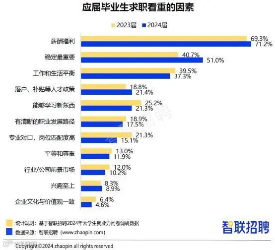 从求职考虑的因素也能看出,应届生毕业生对工作稳定性的重视度在提高。调研显示,2024届求职毕业生中,51%认为“稳定最重要”,比例仅次于“薪酬福利”(71.2%),位列第二。与去年相比,认为“稳定最重要”的比例提升10个百分点。