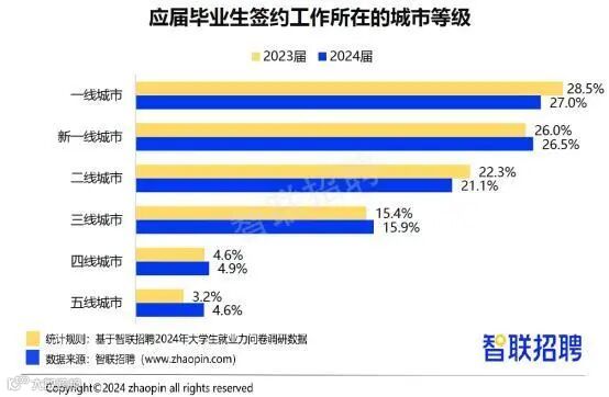 从签约工作所在的城市等级看,签约毕业生中,选择三线、四线、五线城市就业的毕业生分别占比15.9%、4.9%、4.6%,均高于去年的15.4%、4.6%、3.2%。27%的签约工作地点在一线城市,低于去年的28.5%。26.5%的毕业生选择新一线城市,占比高于去年的26%。这一方面反映出,三线及以下城市大力发展经济和城市建设,引才效果显现;另一方面也说明,应届毕业生的就业态度更加实际,选择到就业竞争相对和缓的三线及以下城市发展,就业市场“下沉”趋势初显。