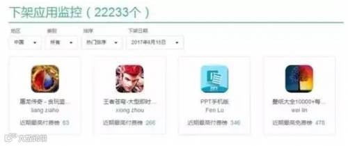 截止到6月16日,中国地区下架应用已经接近3万,包括《天天酷跑》等游戏,其中6月15日一天,最高下架超过2万;美国地区这几天下架的应用也达2万7千个。两个国家大部分下架应用多未在畅销排行(1500名)以内。