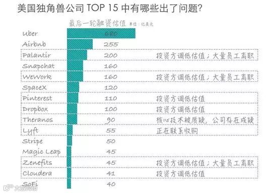 从 2015 年年末开始,富达、普信、摩根斯坦利等多家基金开始调低自己所投独角兽公司的估值。美国前 15 家“独角兽”中,有一半受到影响。