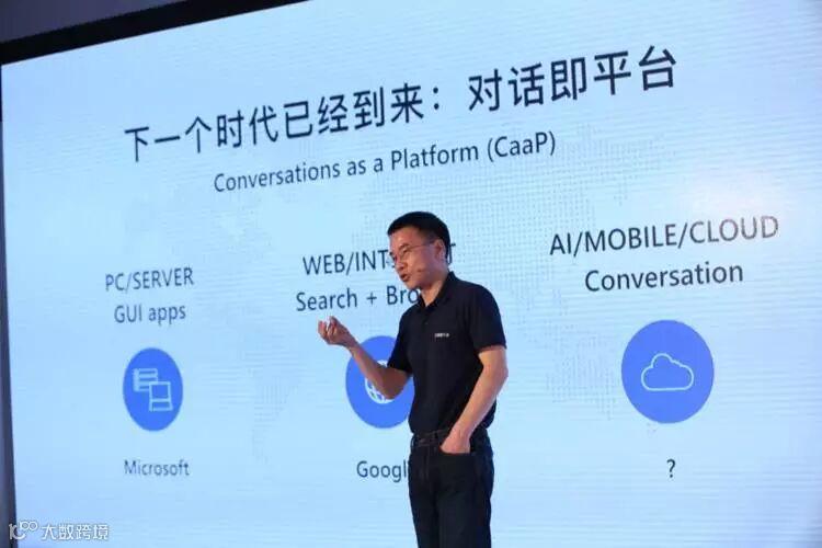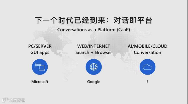 微软认为,今天的移动互联网和云的发展,还只是第三个时代的萌芽,只是这个新时代的过渡阶段。真正的第三个大时代,是人工智能的时代。而它的核心革命,就是「对话即平台」的崛起。我们把它称之为 Conversations as a Platform(CaaP)。实际上,以对话为核心的这个新的时代,在数据量、用户连接和技术条件集大成之后,更像是一种回归。