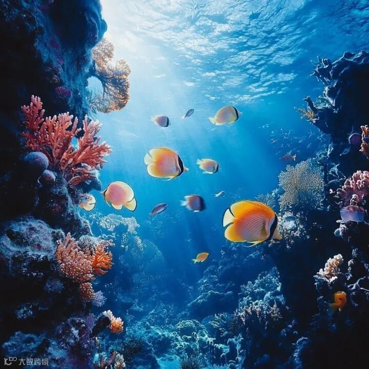 Prompt(仅供参考):绚丽多彩的珊瑚礁间,一群群鱼儿穿梭游弋,宛如海底的舞者。阳光穿透清澈的海水,洒下斑驳光影,增添了几分神秘与梦幻。镜头缓缓拉远,视野开阔,揭示了更加壮观的海底世界,整个画面充满了生命的活力和自然的魅力。
