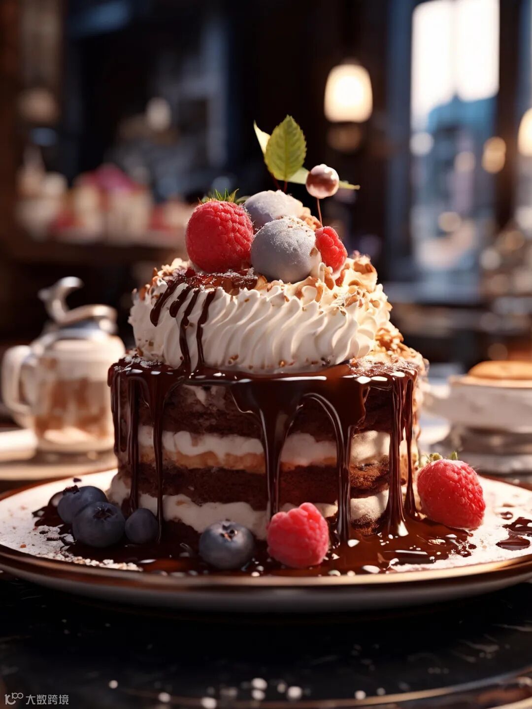 Prompt(仅供参考):一个3D CG渲染的巧克力蛋糕,表面光滑,蛋糕上覆盖着丰富的奶油,点缀着鲜红的浆果,周围环绕着柔和的光线,营造出真实而诱人的视觉效果。