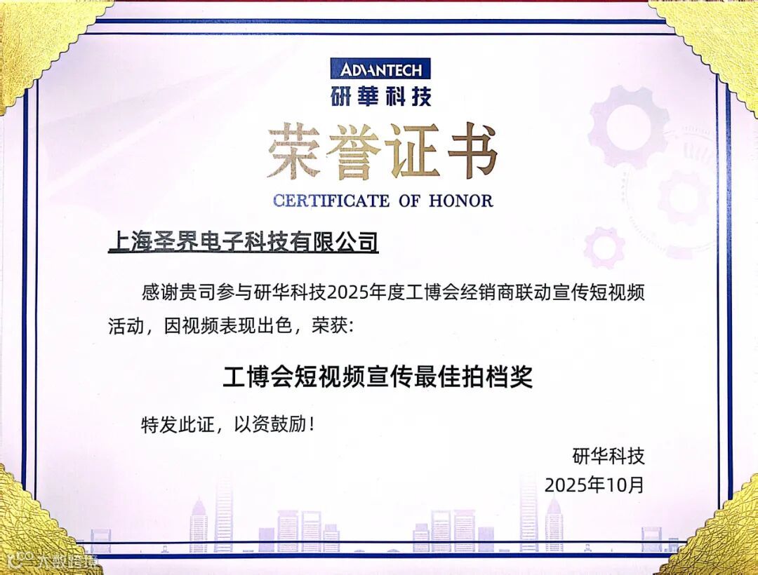 在近期举办的2025研华科技工博会经销商联动宣传活动中,上海圣界电子科技有限公司制作的短视频因内容专业、表现突出,荣获"工博会短视频宣传最佳拍档奖"。这份肯定,将激励我们在研华生态中继续精进,为行业客户提供更专业的服务,创造更大价值。