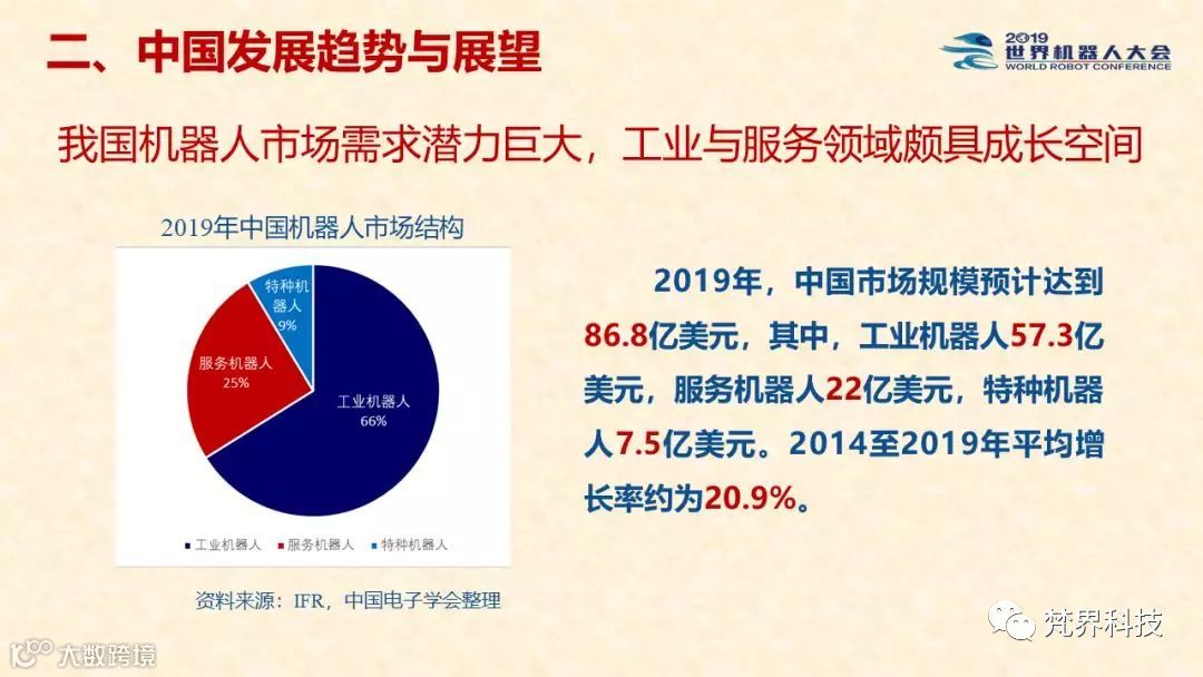 2019年,全球机器人市场规模预计将达到294.1亿美元,2014年至2019年的平均增长率约为12.3%。其中,中国机器人市场规模预计达到86.8亿美元,2014年至2019年的平均增长率达到20.9%。