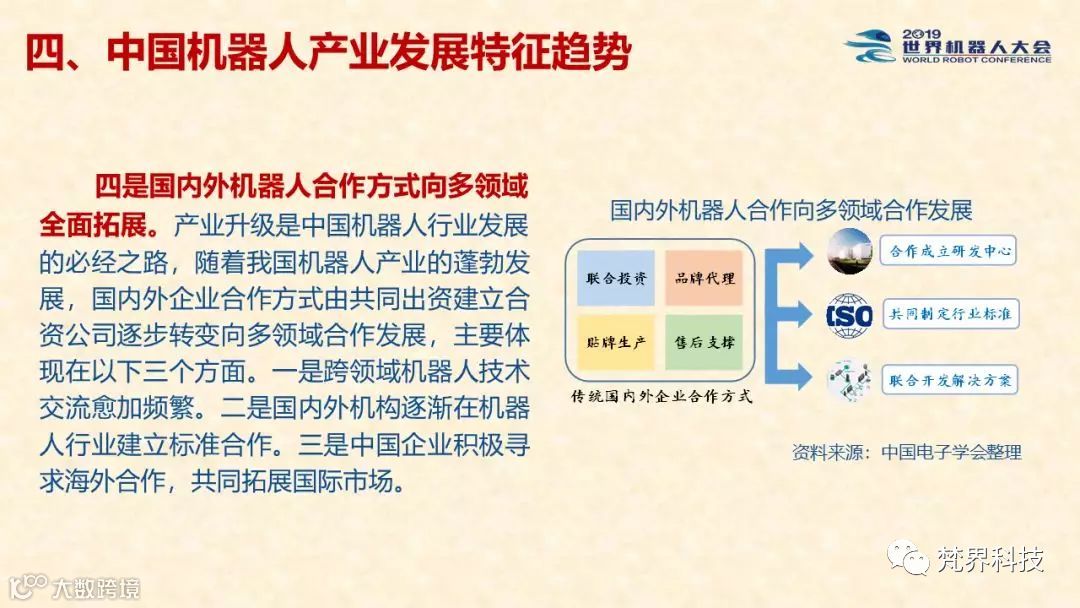 报告还指出,产业升级是中国机器人行业发展的必经之路,随着中国机器人产业的蓬勃发展,国内外企业合作方式由共同出资建立合资公司逐步转变向多领域合作发展,其中中国企业积极寻求海外合作,共同拓展国际市场。