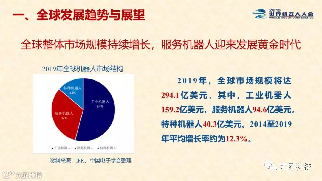 根据报告,当前,全球机器人市场规模持续扩大,工业机器人市场增速回落,服务、特种机器人增速稳定。