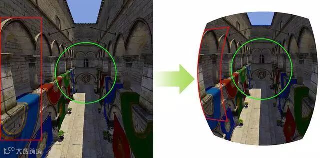 此外,作为VR领域不可或缺的技术之一,眼球追踪技术还可以解决VR图形畸变的问题。图形畸变,同样也是造成使用者眩晕的因素之一。通过上图,我们可以看到,左边就是普通的游戏画面,而右边,就是VR设备里所呈现的画面。由于图像畸变的原因,VR设备所呈现的画面中,图像的边缘已经发生了明显的畸变。即使Oculus曾在此问题上投入了大量的研发成本并应用反畸变算法优化了VR设备的成像,离开了眼球追踪技术,图像边缘的畸变依然无法完美地解决。