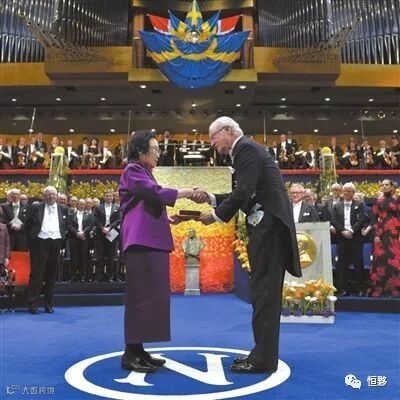 2015年12月10日,屠呦呦在在瑞典首都斯德哥尔摩音乐厅举行接受诺贝尔奖颁奖。
