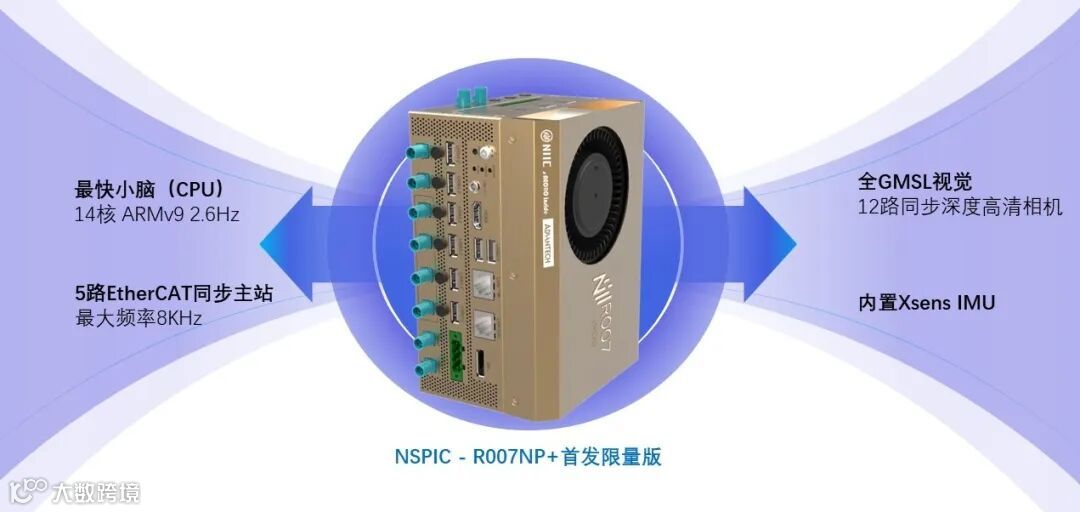 此款具身智能控制器采用 14 核 ARM v9 架构处理器,运行频率高达 2.6GHz,内存支持128G LPDDR5x。同时新品NSPIC-R007具备了AI 算力最高达1035 TFLOPs FP8。如此强大的算力,充分满足当前大模型开源环境的下的强化学习,完美解决了当前很多具身机器人依赖工控机 + 4090 显卡的传统工作模式,真正实现了端到端的高效控制。