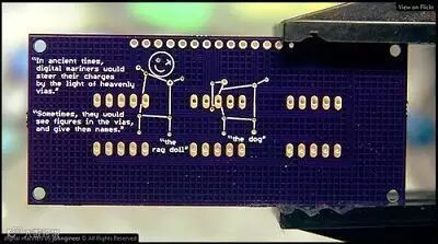 下面是一位自称“johngineer”的网友作品,这家伙的网站(http://www.johngineer.com)有不少很酷的东西(例如一只他自 己做的超酷庞克风手表),还有非常专业的技术文章。“johngineer”没有解释这个电路板的作用,但他在上面印了两段文字,想象未来如果有考古学家挖到这片电路板,会怎么解读这种“文物”?