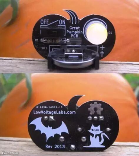 这是low voltage labs开发的南瓜PCB,除了形状很可爱,还印了可爱的图案;这款电路板上面有LED灯泡,就是让你在万圣节放进南瓜灯,不必担心蜡烛会被风吹熄….其实直接当成摆饰也很有味道,而且只要6美元就买得到!
