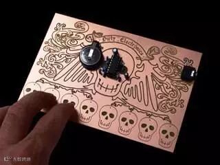 接着是跟前面的街头涂鸦风格完全不同的另一款迷你合成器电路板;电路板上并列的那一排骷髅是合成器的键盘,振荡器(oscillator)的间距是由皮肤接触的电平来控制。事实上,玩这个小东西的秘诀是,在开始弹奏之前先舔一舔(?!)指尖…