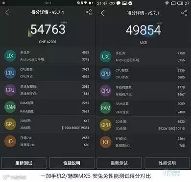 从实际安兔兔跑分中,我们看到一加手机2的分数确实要比魅族MX5要高一些,但细细分析一下下面各项性能评分,还是能够发现一些端倪的。首先是多任务处理能力,一加手机2只有区区4829分,而魅族MX5则达到7158分,这说明后者能够应对更多后台程序开启时的挑战,保证机器的流畅自如。另外一个非常有趣的差别就在于RAM,一加手机2采用4GB RAM,在速度上无疑要比3GB RAM的魅族MX5高,但是运算能力上却要略逊一筹,这代表在同时使用相同操作的时候,一加手机2遇到卡顿的风险和几率要比魅族MX5高。