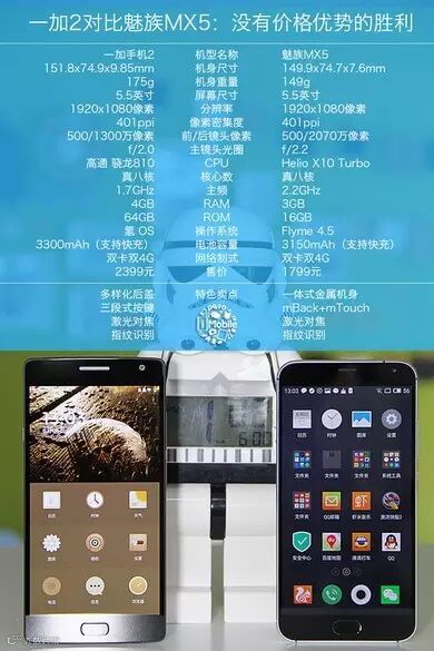 我们手里的一加手机2是高配版,4G RAM、64GB ROM版本,与标配版相同的是处理器均为高通骁龙810,只可惜是低频版,主频只有1.7GHz。而魅族MX5使用的则是最新的Helio X10 Turbo处理器,该处理器最大的特点就是功耗与性能兼备。一加手机2采用低频版的高通骁龙810相比也有这样的想法。