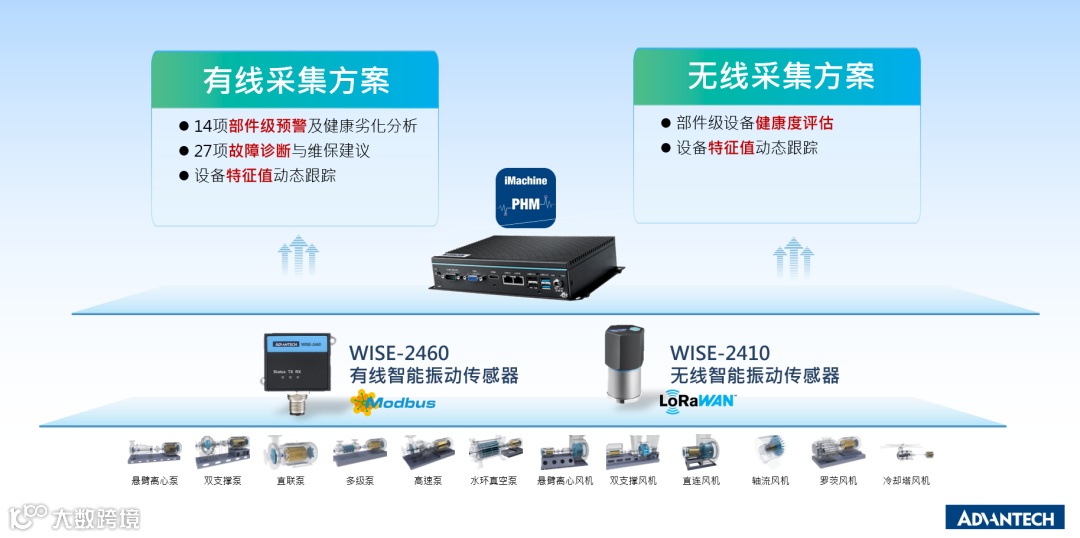 为实现对设备健康状态的实时监控和预警,有效预防设备故障,研华PHM Edge AI设备健康诊断终端解决方案基于WISE-2400系列振动传感器提供有线/无线两种数据传输方案,将 PHM设备故障AI机理算法模型深度集成于研华UNO-247智能盒子中,针对泵、风机等设备提供智能预警、故障诊断与健康评估服务,可提前1-3个月识别潜在故障,减少非计划停机。